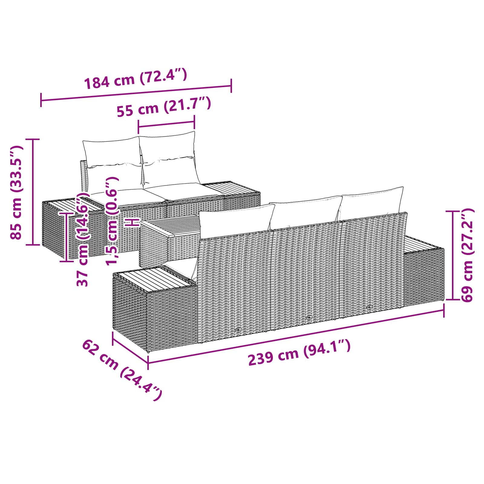 Dette Have Sofa Sæt blander komfort med et moderne design, hvilket gør det til et perfekt valg til at løfte dit udendørs rum til sammenkomster med venner og familie. Lavet af sort polyrattan med varme trædetaljer, er det stiligt og forvandler din altan eller have til et hyggeligt sted.